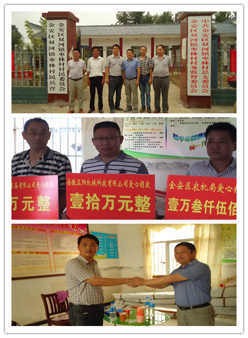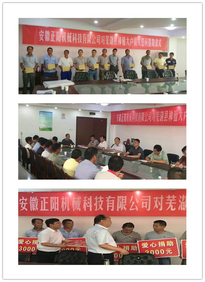 同時(shí)我公司針對(duì)今年長(zhǎng)江中下游、江淮區(qū)域發(fā)生的嚴(yán)重的洪澇災(zāi)害勇于擔(dān)當(dāng),注重快速發(fā)展自身的同時(shí)更高度重視企業(yè)社會(huì)責(zé)任,本著以回報(bào)社會(huì)為己任;企業(yè)利潤(rùn)來(lái)之于民、用之于民;義利兼顧的宗旨,安徽正陽(yáng)機(jī)械科技有限公司總經(jīng)理張為法于2016年7月13日下午前往“正陽(yáng)”糧食烘干機(jī)主銷(xiāo)區(qū)域安徽蕪湖、六安、湖北孝感等受災(zāi)嚴(yán)重地區(qū)捐贈(zèng)現(xiàn)金數(shù)十萬(wàn)元,幫助災(zāi)區(qū)人民萬(wàn)眾一心共抗洪災(zāi),盡快恢復(fù)生產(chǎn),讓受災(zāi)群眾真實(shí)感受到黨和政府的溫暖、民營(yíng)企業(yè)家的責(zé)任,公司以正能量品牌的形象和風(fēng)范履行了自身應(yīng)盡的社會(huì)責(zé)任。