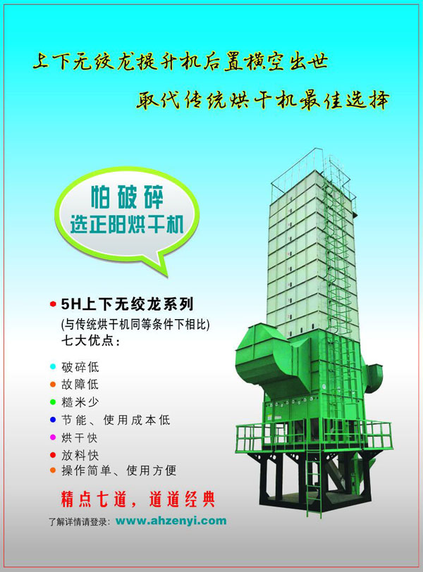 為了更好的滿足市場(chǎng)和客戶的需求,正陽(yáng)科技推出一款“上下無(wú)絞龍系列”谷物烘干機(jī)。糧食破碎霉變猛于虎,正陽(yáng)烘干機(jī)保護(hù)糧食安全保護(hù)人類健康。正陽(yáng)烘干機(jī)上下無(wú)絞龍系列比傳統(tǒng)烘干機(jī)節(jié)能減耗,是中國(guó)糧食烘干機(jī)上下無(wú)絞龍?zhí)嵘龣C(jī)后置發(fā)明者與領(lǐng)航者。